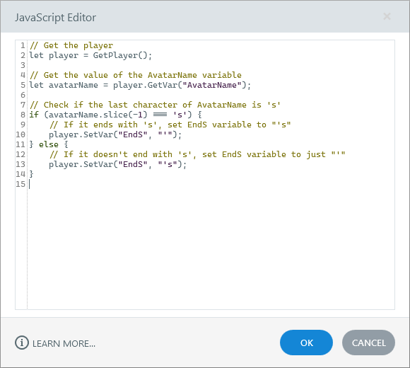 Finally, we update the EndS variable in Articulate Storyline to reflect the correct possessive form.